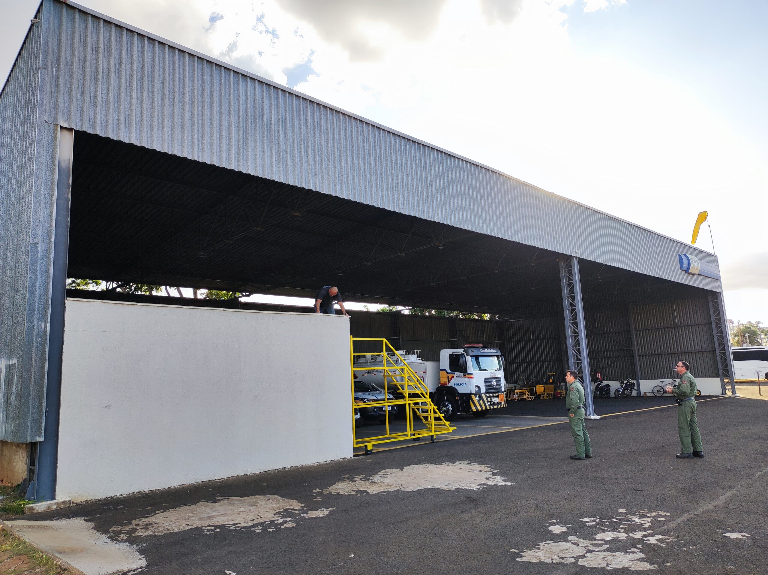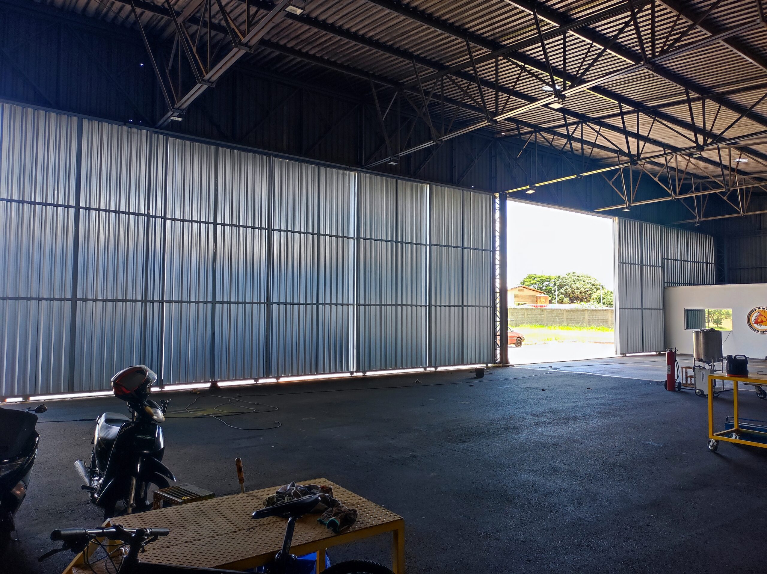 A estrutura metálica foi projetada para oferecer resistência, durabilidade e operação eficiente, atendendo às demandas específicas de um hangar operacional, com foco em segurança patrimonial e controle de acesso.